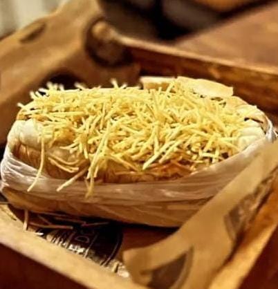 pão selado na chapa, molho de tomate, calabresa na chapa, muçarela, milho, passas, batata palha extra fina, um molho gourmet a escolher