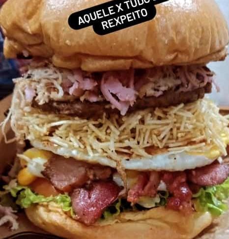 pão brioche selado na chapa, DOIS bifes, alface, muçarela, tomate, bacon, ovo, milho, presunto, frango, batata palha extra fina, um molho gourmet a escolher